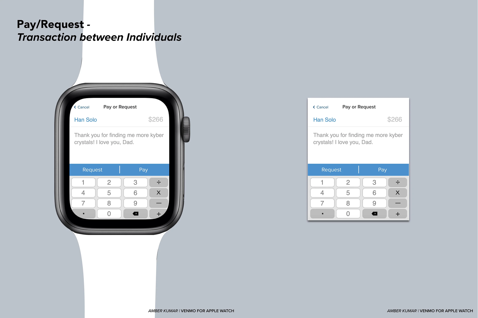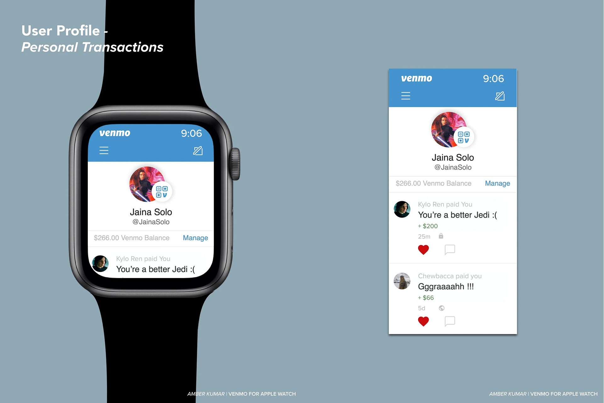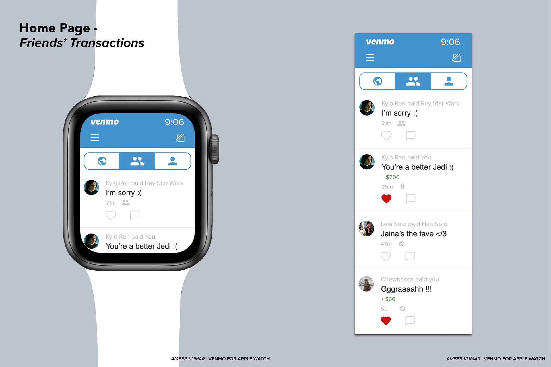 I decided to take a shot at designing the Venmo companion app for the Apple Watch. I wanted to make sure that I was able to fully flesh out the product within the parameters of the screen size while staying true to my source material.