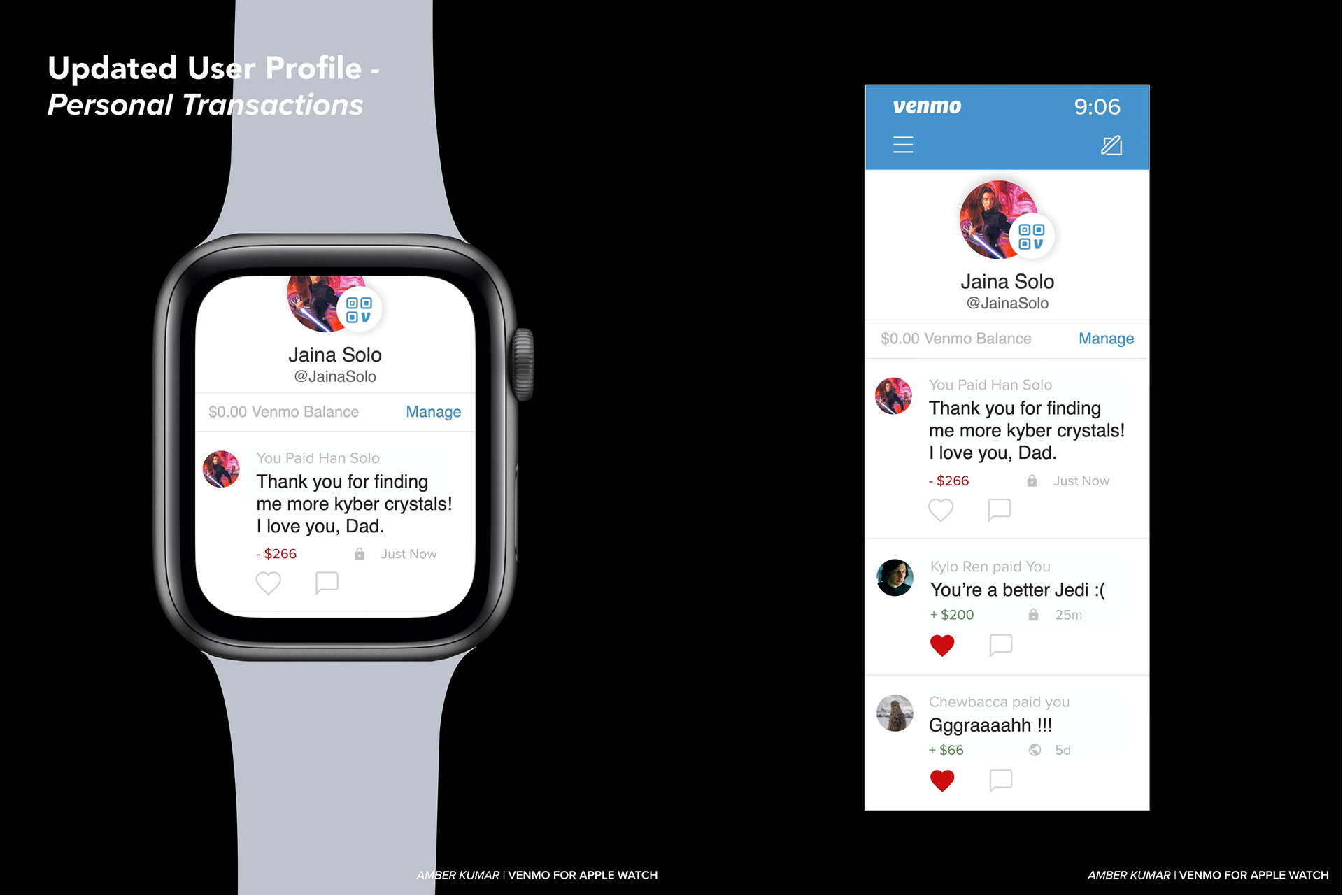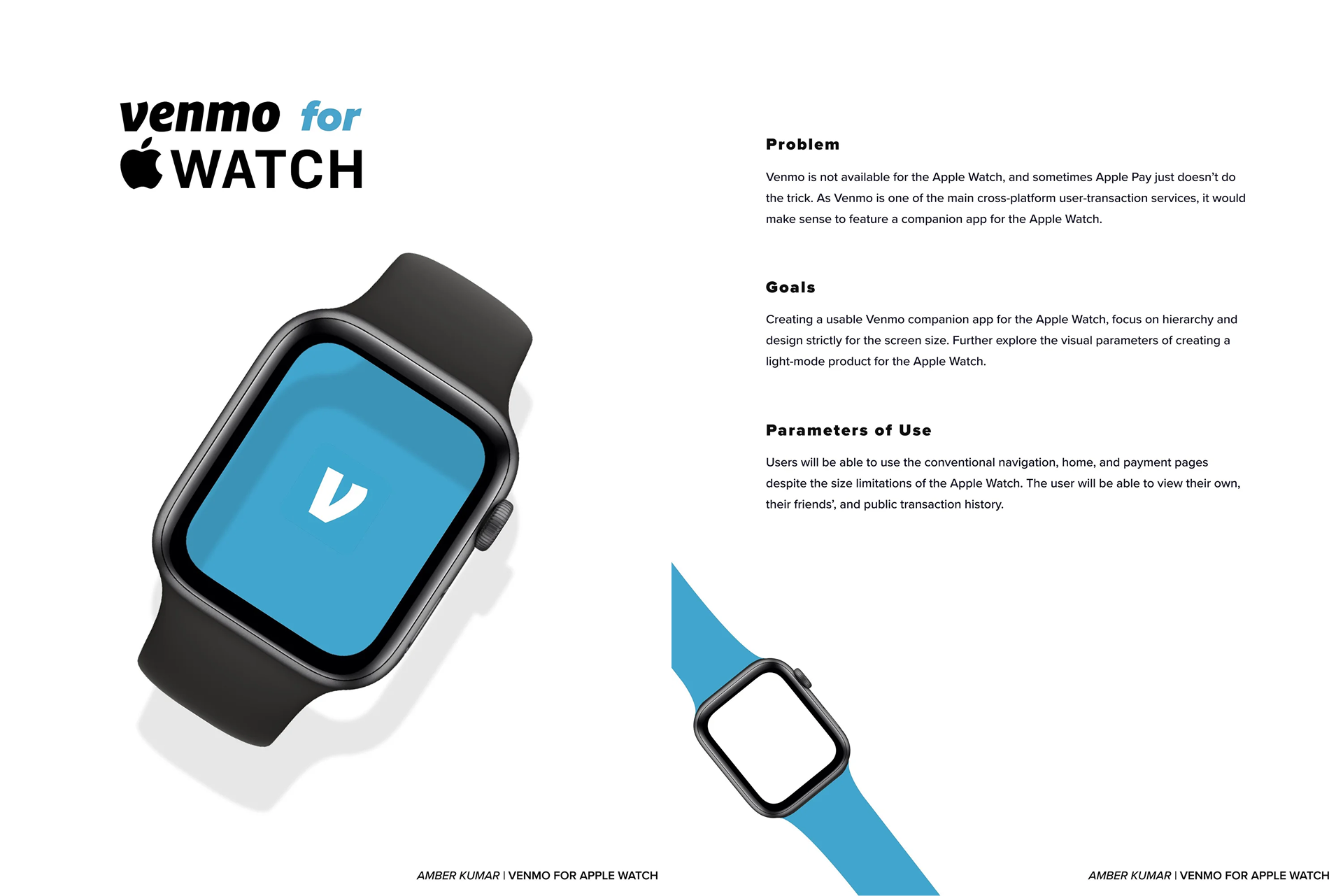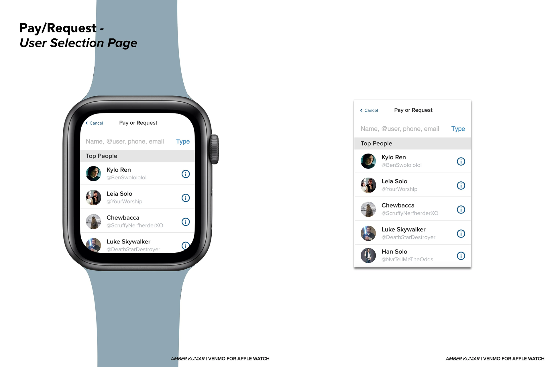 I decided to take a shot at designing the Venmo companion app for the Apple Watch. I wanted to make sure that I was able to fully flesh out the product within the parameters of the screen size while staying true to my source material.